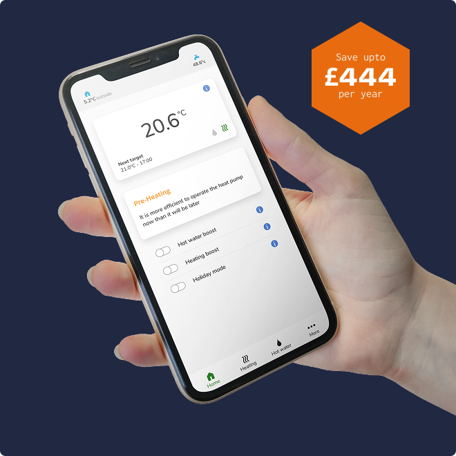 Save up to £444 a year in energy bills, Intelligent heat pump control designed specifically to optimise heat pump efficiency, reducing running costs by up to 31% through smart tariff integration, live weather data, and advanced heating algorithms. It replaces traditional on/off switching with continuous modulation, manages heat pump flow temperatures, and offers remote control/monitoring via a smartphone app